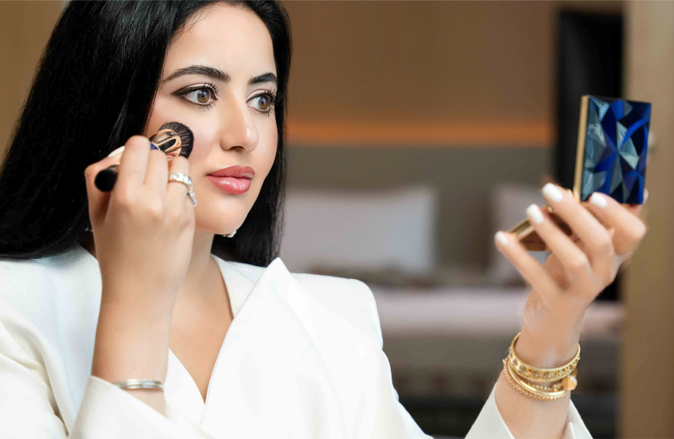 After applying, use a clean blending brush or makeup sponge to seamlessly blend the highlighter into your skin. Take your time to blend for a flawless finish & adjust the intensity as needed to perfect your glow.